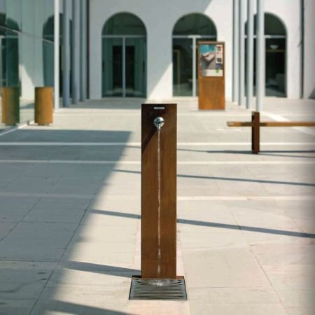 Fuente urbana modelo Corten construida con tubo de acero y pintado imitacion corten y varnizado. Incorpora el detalle de la placa de sujeción del grifo contruída en acero inoxidable con forma de gota de agua y grifo cromado con sistema pulsador. Su elegante diseño y combinación de materiales permite su instalación tanto en lugares modernos como rústicos.