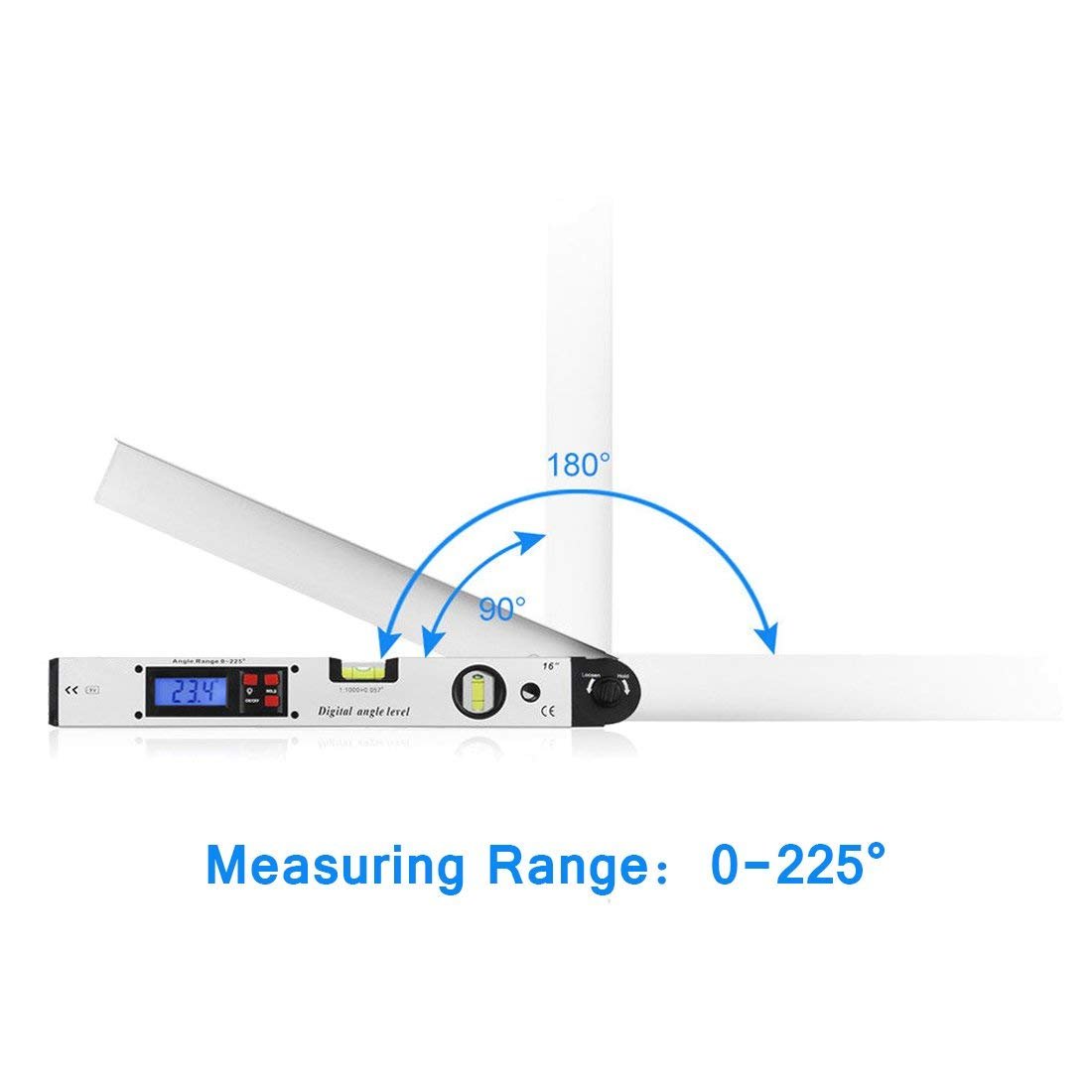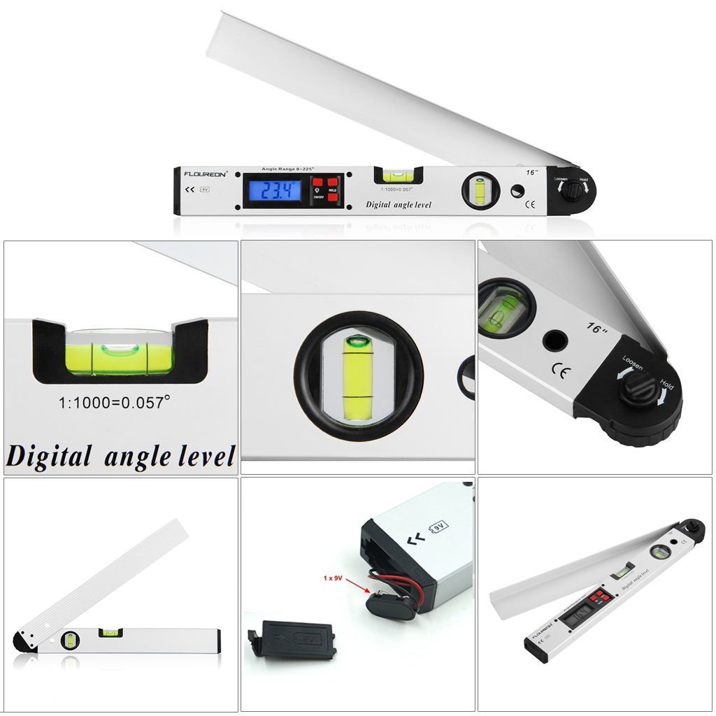 - El manejo es fácil y sencillo. la burbuja vertical y horizontal funciona perfectamente. después de pulsar el botón de ON se digital muestra el ángulo correspondiente en grados. el pantalla es bastante grande y muy legible. después de 5 minutos, se apagará la pantalla incluso AB, para proteger a la batería.